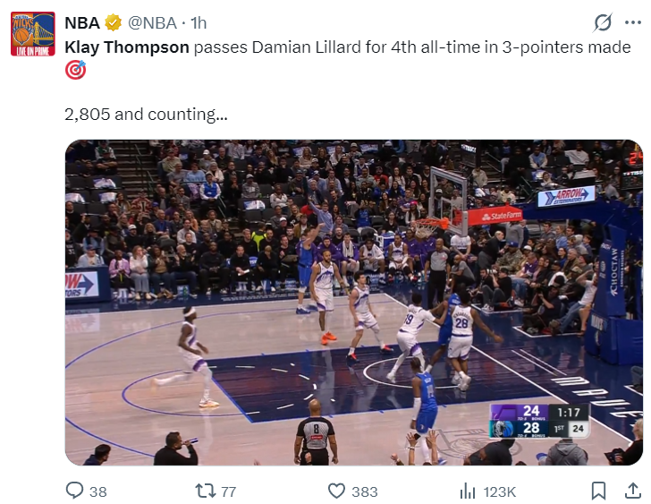 北京时间1月16日,独行侠替补克莱-汤普森完成了职业生涯2805+三分超越达米安-利拉德升至历史第四位,在他身前只剩下库里、哈登、雷阿伦,而且这场比赛独行侠144-123狂胜爵士,克莱的里程碑之夜非常耀眼。